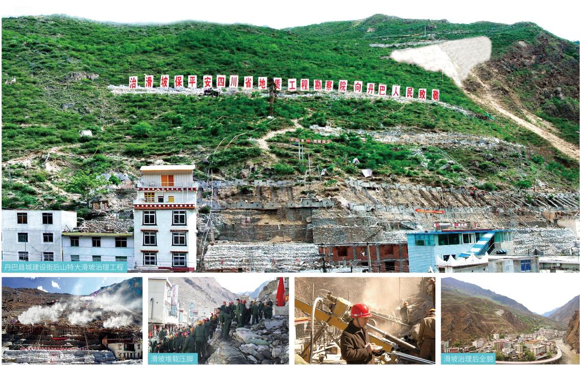 2005年1月,甘孜州丹巴縣城建設(shè)街后山特大滑坡(225萬方)突發(fā)變形,其變形速度之大、危害之嚴重、應(yīng)急治理難度之大屬國內(nèi)罕見。滑坡直接威脅丹巴縣城存亡。川勘集團臨危受命,大膽創(chuàng)新,制定出“前緣堆載、滑坡體實施錨索、框格梁鎖住滑坡”的科學(xué)治滑方案,冒著生命危險,拼時間搶速度,“邊滑邊治”,最終勝利完成四川省委省政府“力爭不滑坡、確保不死人”的任務(wù),實現(xiàn)了滑坡治理史上的一個世界性創(chuàng)舉。