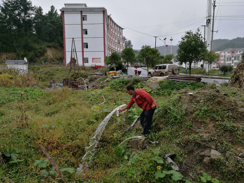 專業引領,探采結合,成井出水。項目組充分發揮我院水文地質、水文物探、鉆探多專業優勢,技術人員協同攻關,首先通過地質分析尋找富水地段和儲水構造。然后布置物探進行勘查。最后針對工作區地層巖性和地質構造特點,進行成井設計,并按設計進行施工。項目組設計的4口探采結合井已全部完成,成井率100%。尤其是布設在貴州省赫章縣安樂溪鄉鄉政府的探采結合井(編號:ZK29),該井井深160.2米,水位位于井口,微承壓,出水量500立方米/天左右時的穩定降深不到30米,該井可補充安樂溪鄉集中供水,惠及人口近萬人,有效的緩解了安樂溪鄉群眾飲水困難的問題,受到了安樂溪鄉政府和赫章縣國土資源局的高度贊揚。