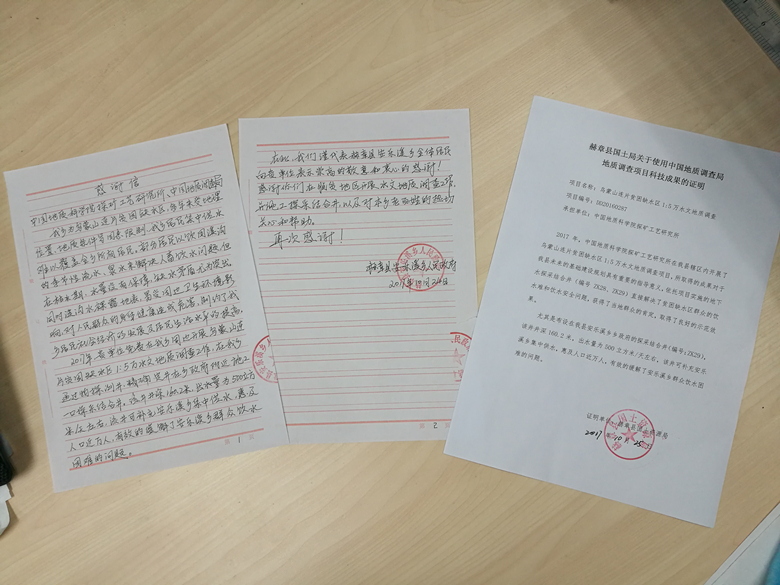 當地政府分別給實施該項目的中國地質調查局、中國地質科學院探礦工藝研究所以及我院授予錦旗,并親筆手寫感謝信,感謝項目組在脫貧地區開展水文地質調查和施工探采結合井工作,以及對地方老百姓的熱切關心和幫助。