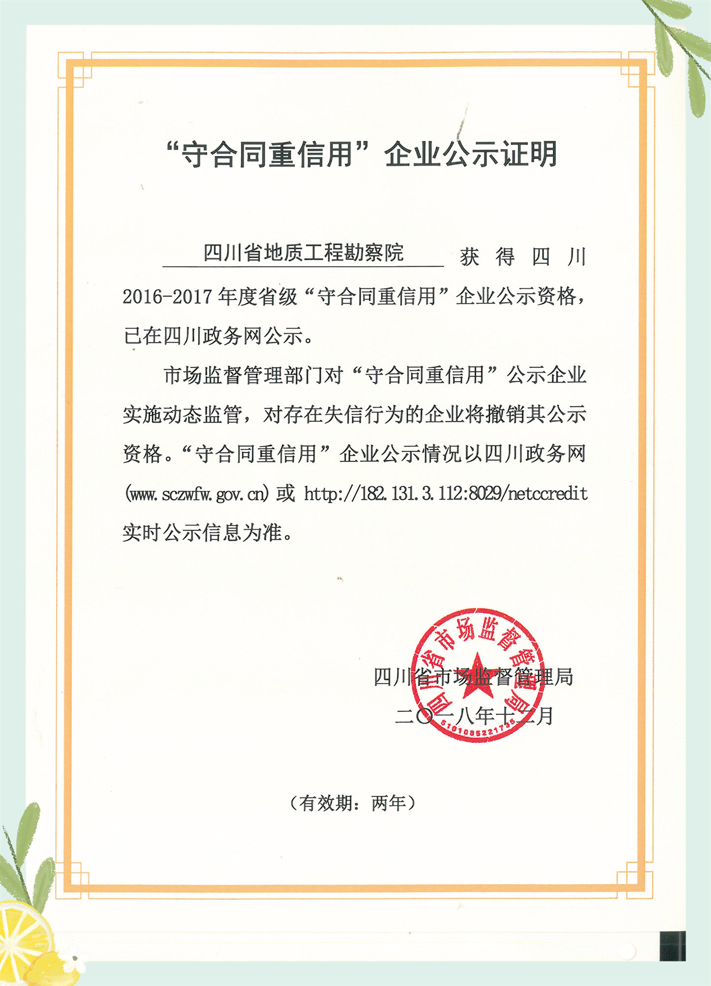 近日,經四川省市場監督管理局評比公示,我院再次獲得四川省“守合同重信用”企業稱號。我院自2006年開始參與“守合同重信用”企業的評選活動以來,至今已連續12年未間斷獲評“守合同重信用”企業。
